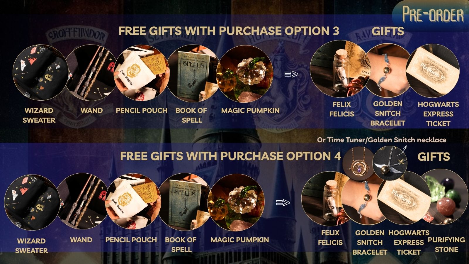 - **Quà tặng:** Lọ Phúc Dược, Sỏi thanh lọc, Vòng tay Snitch, Xoay thời gian, Vé tàu